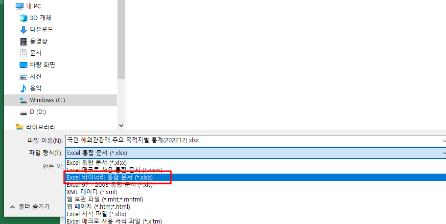 - 저장 형식 변경입니다. Excel 바이너리 통합 문서로 저장합니다.
