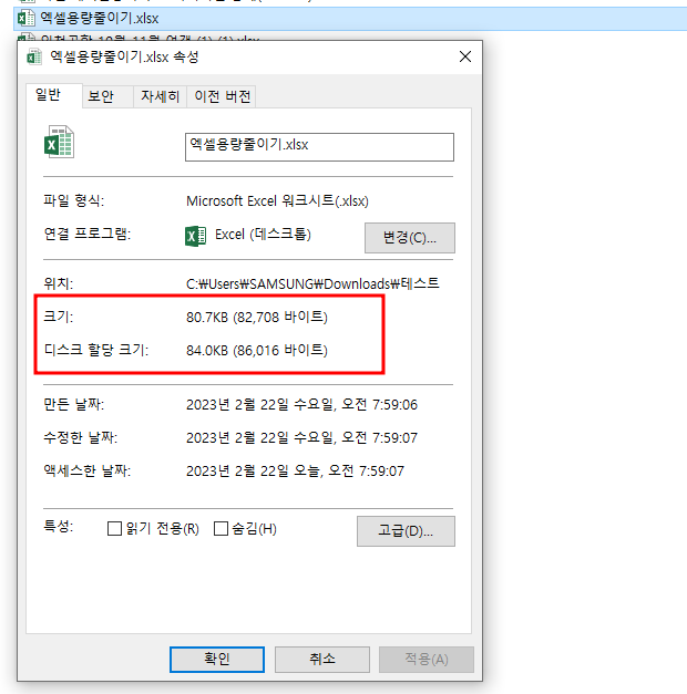 보시다시피 크기가 줄어든 것을 확인할 수 있습니다. 엑셀의 용량이 커서 메일에 첨부가 안 되거나 열리지 않을 때 위와 같은 방법으로 손쉽게 용량을 줄일 수 있다는 점을 기억해 주세요.