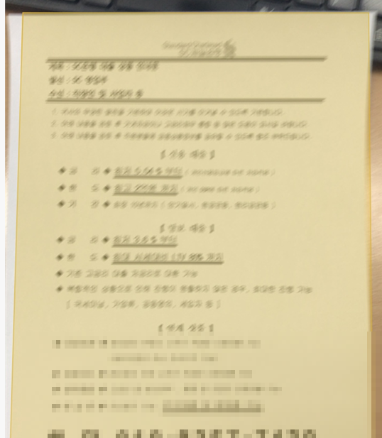 그럼 문서 위에 카메라로 찍습니다. 자동으로 설정되어 있기 대문에 문서 위에 올려놓으니 노랑 화면이랑 겹치면서 자동으로 찍힙니다. 저는 캡처를 하느라고, 수전증이 있는지 떨리면서 화면이 전체적으로 흔들렸네요... 양해 부탁드립니다.