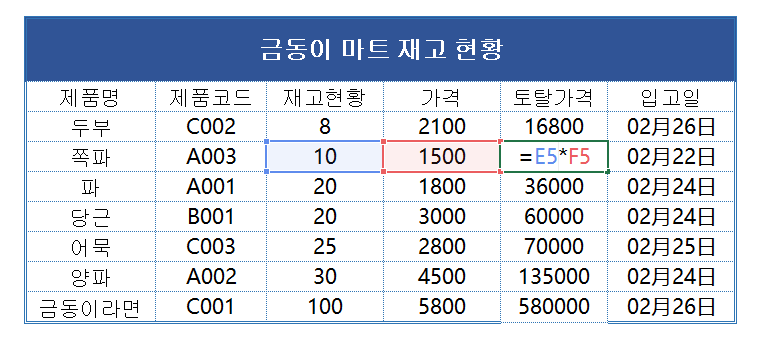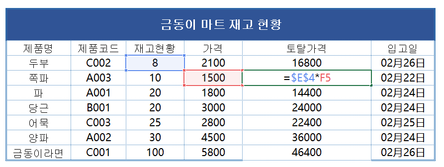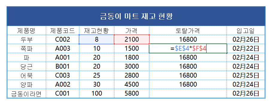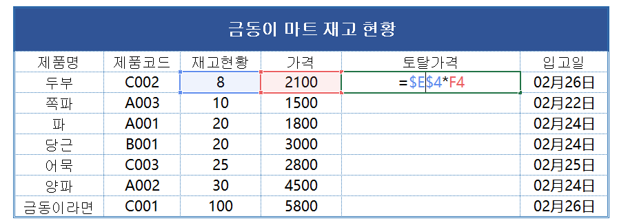 첫 번째 예시와는 다르게 F 열의 행값들이 변한 것을 볼 수 있습니다. 재고는 두부의 8개로 고정이고, 가격은 각 셀에 맞는 가격들이 포함돼서 계산됩니다. 즉 열값은 고정이고 행값들이 변한 것을 알 수 있습니다.