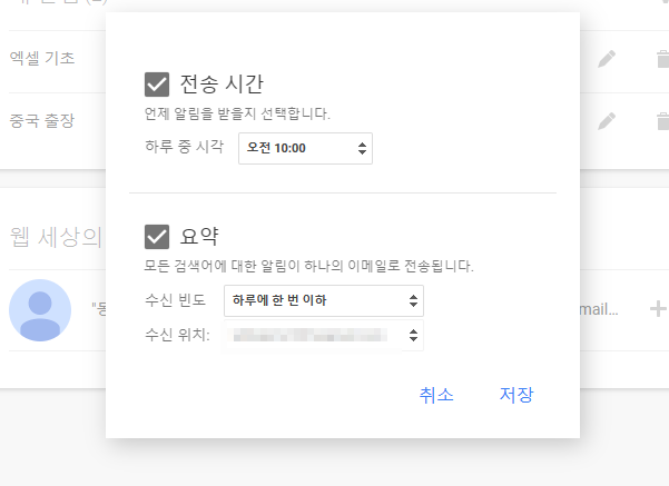 전송시간 및 요약을 설정해 주고 저장을 클릭합니다. 저는 오전 10시에 하루에 한 번 이하로 이메일로 전송되게 설정해 두었습니다.
