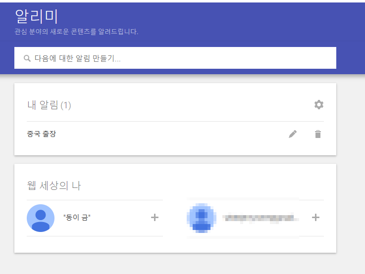 저는 기존에 중국 출장 키워드를 넣었습니다. 그럼 새로운 알리미를 만들어 보겠습니다.