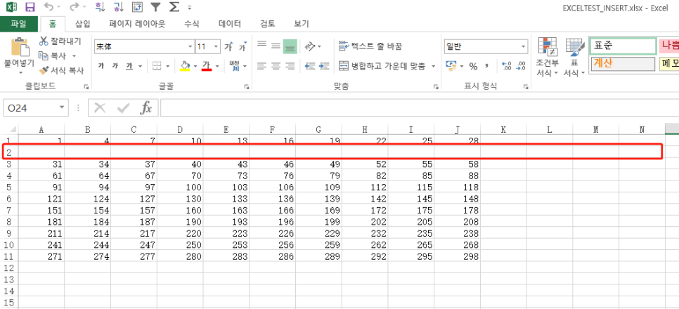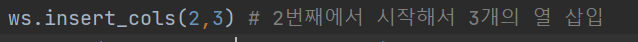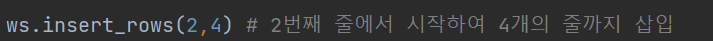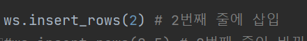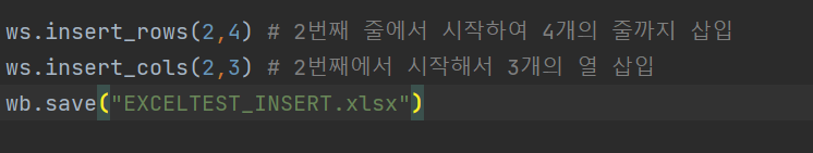 2번째 줄에 빈칸 삽입한다는 구문입니다. 숫자를 바꾸면 4번째 10번째 손쉽게 삽입할수 있겟죠. 구문을하고 저장을 다른파일로 한번 해보세요. wb.save("EXCELTEST_INSERT.xlsx")