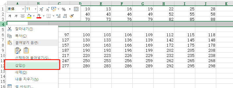2. 이제 빈칸을 삽입해봐야겠죠..엑셀에서는 우측 마우스 클릭후 삽입 누르면 금방 삽입이 됩니다.