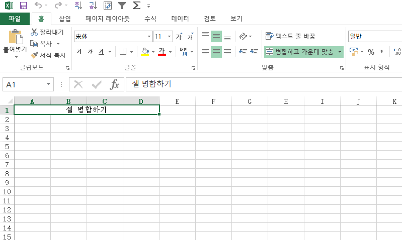 실행을 한 후, 엑셀을 열어보면 깔꼼하게 병합되고 가운데 정렬한게 보여질 겁니다.