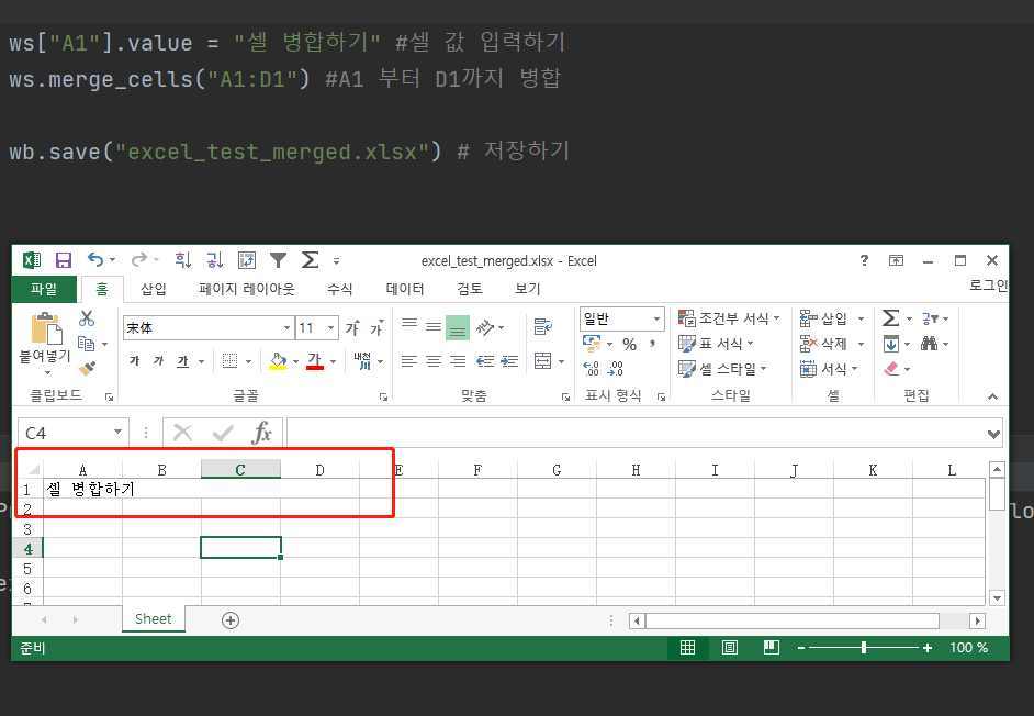 기존에 저장했던, 파일을 로드워크북으로 해서 불러옵니다. 병합은 merge를 써주었다면, 해제는 기존에 병합되었던 셀을 A1에서 D1셀을 unmerge만 쓰면 간단히 해결됩니다. 손쉽게 병합해제한것을 보실 수 있을겁니다.