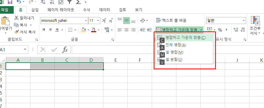 그럼 위 화면이 뜰텐데요, 저기서 본인이 병합하고 싶은 키를 누릅니다. 저는 C를 많이 씁니다. 가운데 정렬까지 해주어서 편합니다.