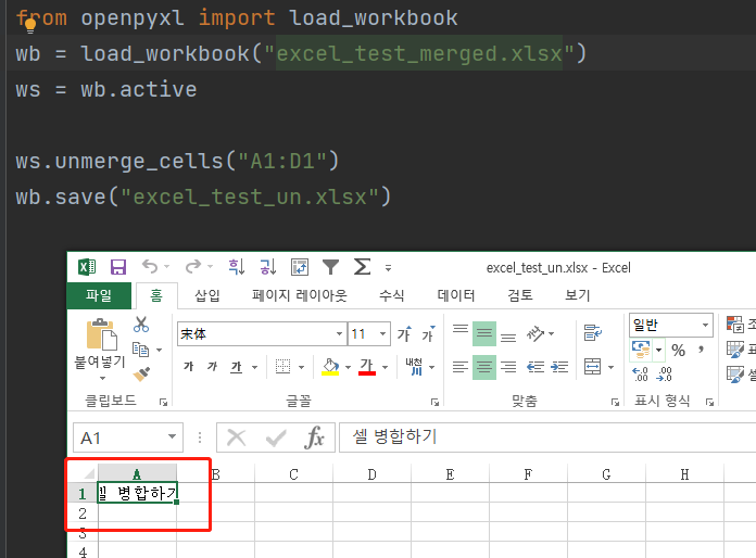 기존에 저장했던, 파일을 로드워크북으로 해서 불러옵니다. 병합은 merge를 써주었다면, 해제는 기존에 병합되었던 셀을 A1에서 D1셀을 unmerge만 쓰면 간단히 해결됩니다. 손쉽게 병합해제한것을 보실 수 있을겁니다.