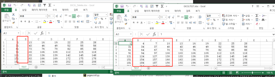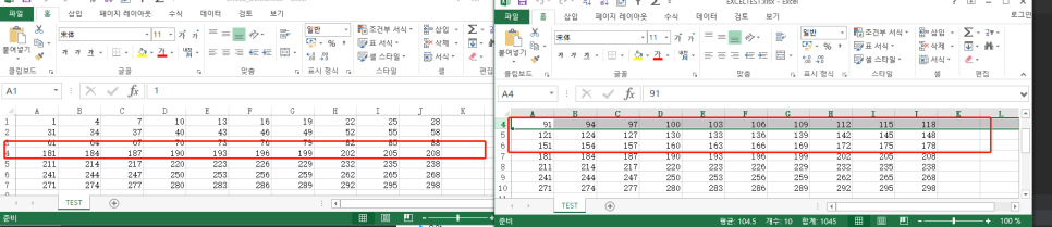 오른쪽 원본 엑셀파일에 보시면 B,C,D에 있던 숫자들이 왼쪽 화면에는 없어진걸로 보여집니다. 그리고 숫자들이 왼쪽으로 당겨진것을 볼 수 있습니다.