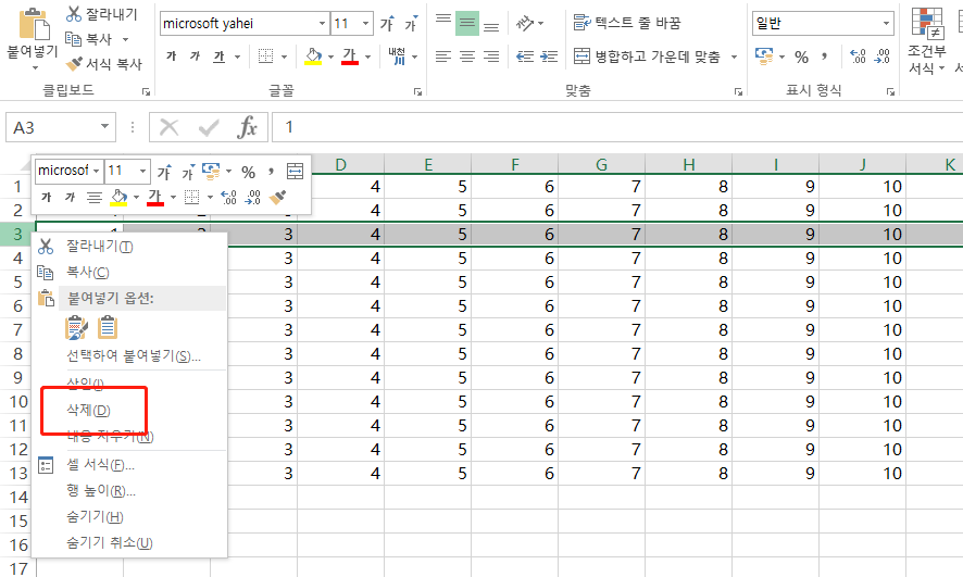마우스 삭제하는 방법 행에 마우스 오른쪽 버튼 후 삭제 클릭하면 손쉽게 삭제가 되겠죠.