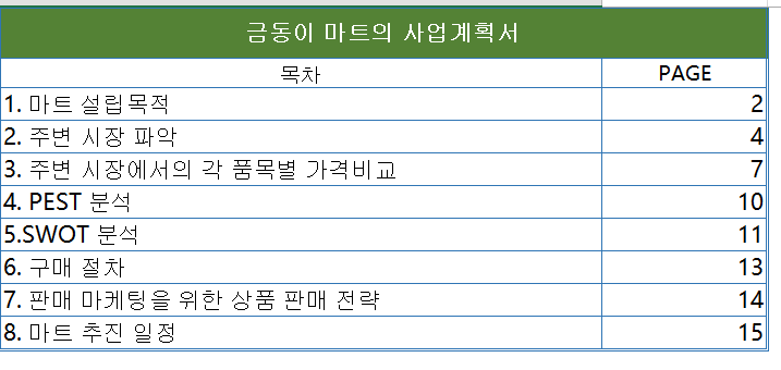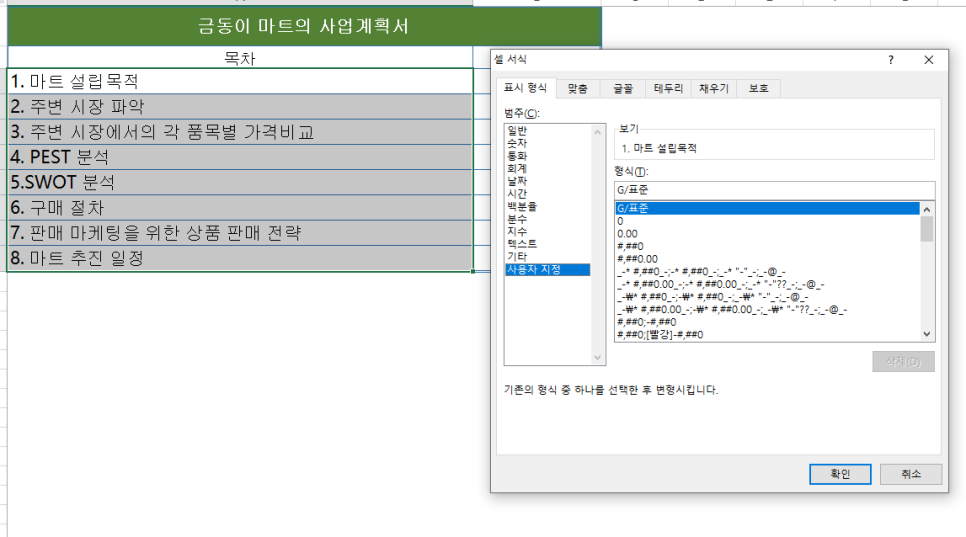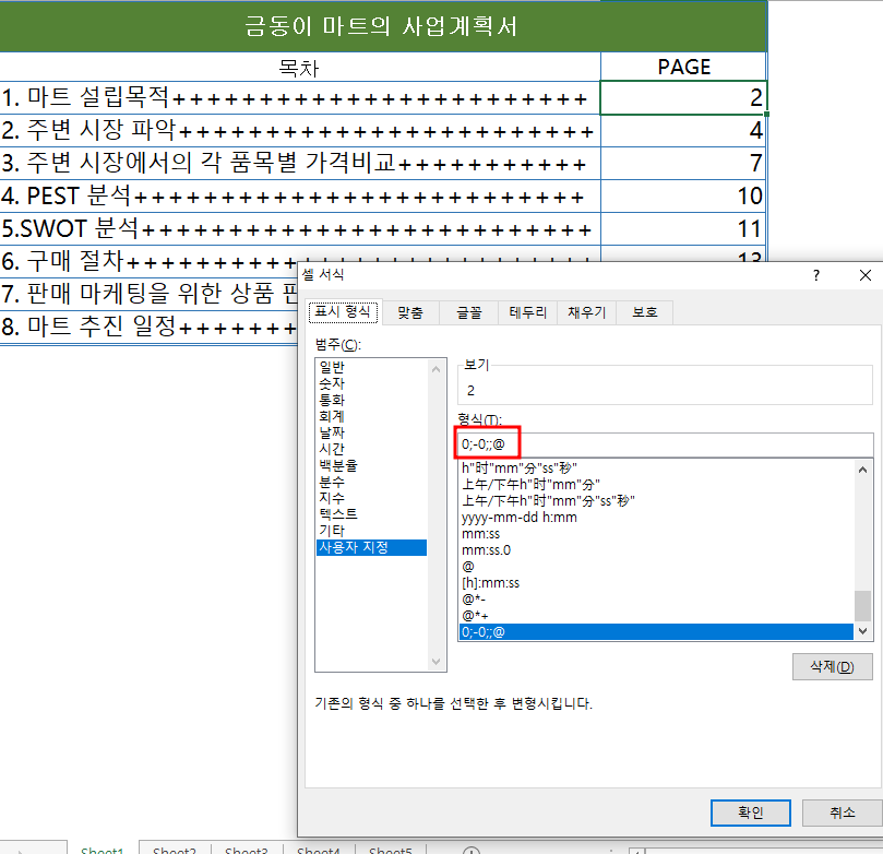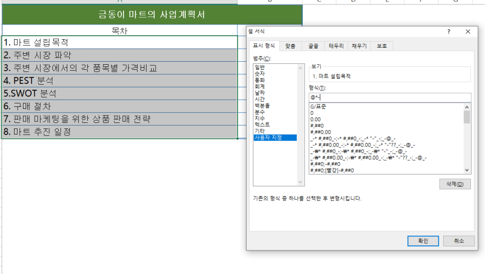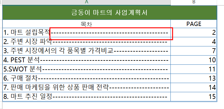 위와 같은 금동이 마트의 사업계획서 표가 있습니다. 하지만 목차 부분에 빈 공간이 너무 많은 것을 알 수 있습니다. 이 빈 공간을 하이픈으로 채워보기를 해 보겠습니다.