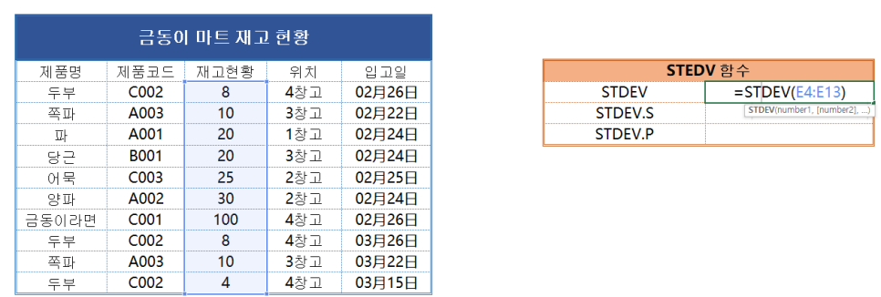 금동이 마트의 재고 현황에 대하여 표준편차를 구하려고 합니다.
