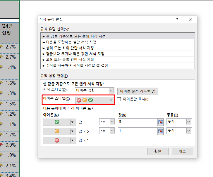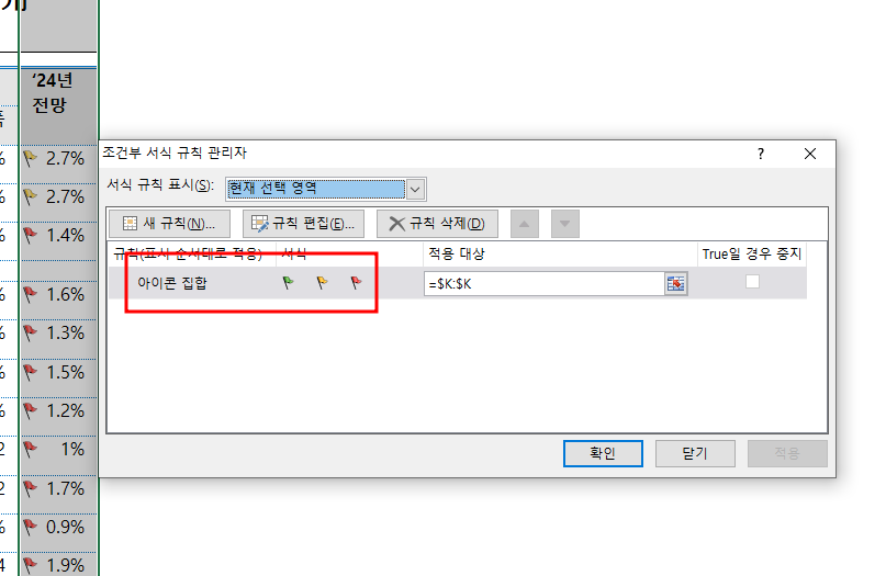 홈 탭 - 조건부 서식 탭 - 아이콘 집합을 클릭합니다. 그래서 우리가 사용하고 싶은 아이콘 스타일을 설정해 줍니다. 한번 해 볼까요, 깃발로 설정을 해 보았습니다. 그러나 우리는 이 수치를 인터넷에서 다운로드했고, 표시 형식 지정을 사용자 지정으로 정해졌습니다. 그럼 규칙 관리에서 한번 확인을 해 보겠습니다.