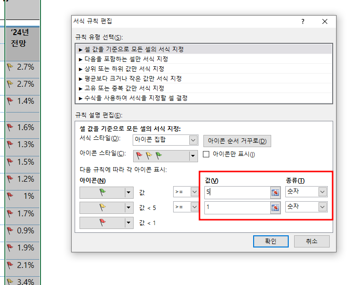 백분율이긴 하지만, 제가 임의로 설정을 해 준거기 때문에, 종류를 숫자로 바꾸고 값들을 바꾸어 보았습니다. 5 이상인 것들은 녹색 깃발 1이하인 것들은 빨강 깃발 그 외의 것들은 노랑 깃발로 표시를 해 줍니다. 그럼 잘 설정되었는지 한번 살펴보겠습니다.