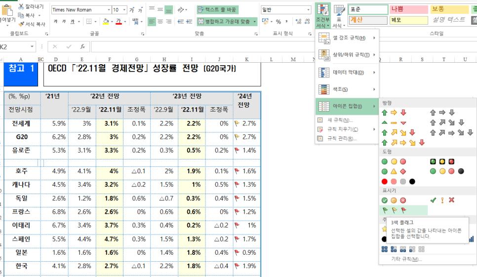 오늘은 G20 국가에 대한 조건부 서식 중 아이콘 집합을 적용해 보았습니다.