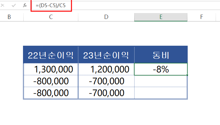 우선 작년 순이익이 130만원인데 올해 순이익은 120만원인데 작년에 비해서 -8%가 빠진 수치입니다.(올해 순이익-작년 순이익)/작년 순이익으로 계산을 해주었을경우 -8% 동대 비 -8%가 떨어졌습니다. 그럼 음수일 경우는 어떻게 되는지 확인해 보겠습니다.