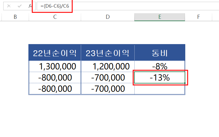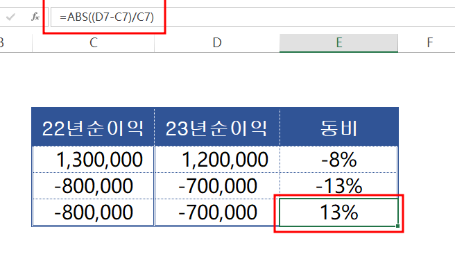 똑같이 동비를 적용해 주었더니, -13%가 빠집니다. 이상하죠. 22년 순이익은 -80만원 적자이고, 올해는 -70만원 적자인데 적자폭이 감소를 했는데 왜 동비 -13%가 될까요?? 값이 잘못되어진 것을 알 수 있습니다. 그럼 우리는 여기서 절대값 ABS를 이용해 보겠습니다.