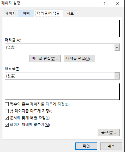 - 여백: 위쪽,아래쪽,왼쪽, 오른쪽,머리글, 바닥글등 여백을 설정할 수 있으며, 페이지 가운데 맞춤을 클릭하여 페이지가 가로로 맞출지, 세로로 맞출지를 할 수 있습니다.