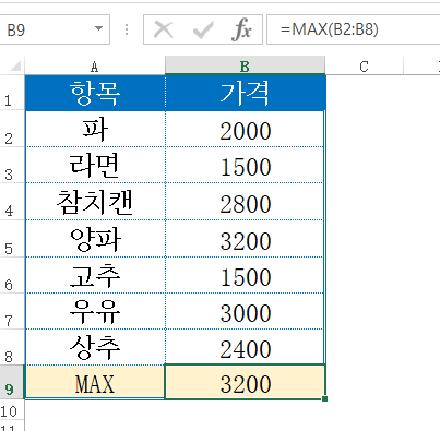 MIN을 이용하여 가장 작은 값 라면의 값을 출력했습니다. MAX를 이용하여 가장 큰 값 양파의 가격을 출력했습니다