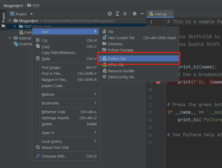 폴더에서 NEW를 선택 후 파이선 파일을 선택하고 이름을 설정해 줍니다.