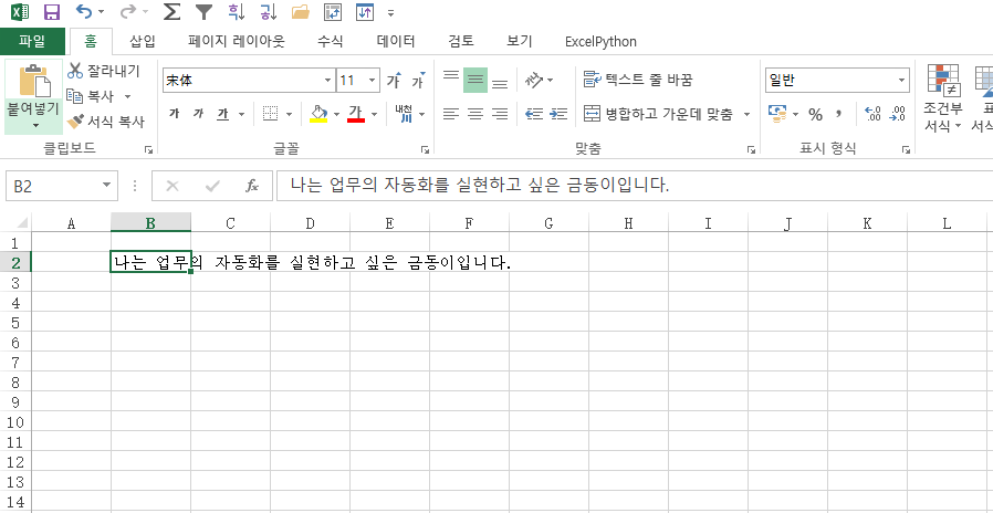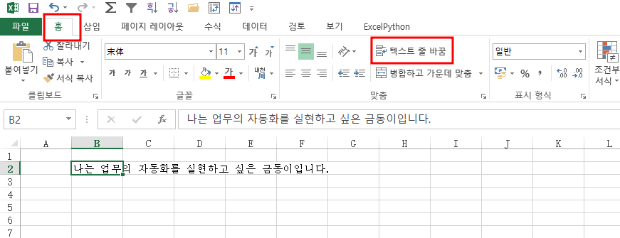 클릭 후 B2셀이 줄 바꾸기가 된 것을 볼 수 있습니다. 지금은 여러줄로 되어있지만 열너비를 설정하면 2줄로 표현 할 수 있겠죠.