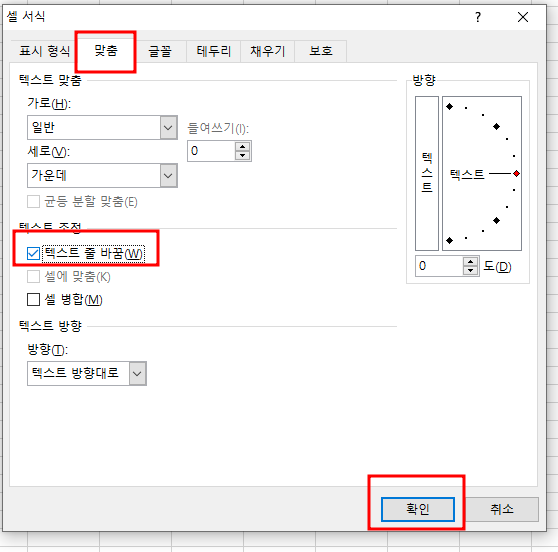 맞춤 탭에서 - 텍스트 줄 바꿈을 클릭합니다. 그럼 손쉽게 셀 전체에 줄 바꾸기를 할 수 있습니다.