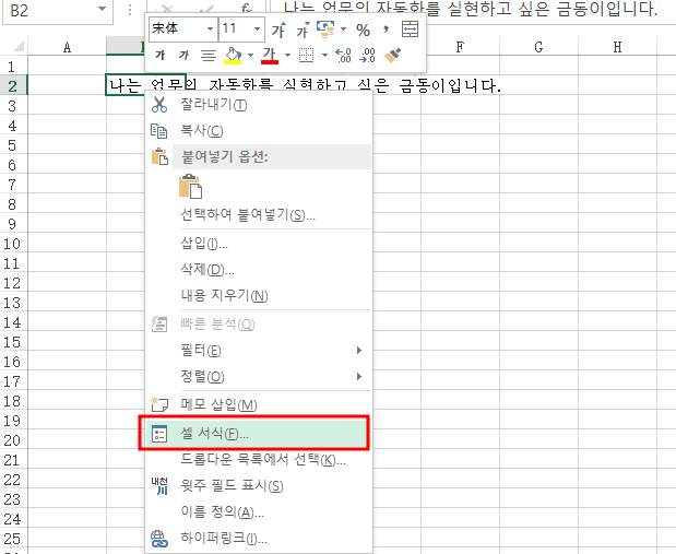셀에서 오른쪽 마우스 클릭 후 셀서식을 클릭합니다.