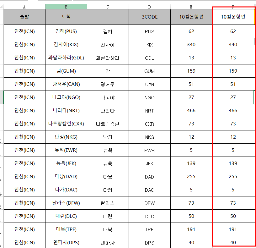 강제로 10월 운항 편 숫자가 채워진 것을 볼 수 있습니다.