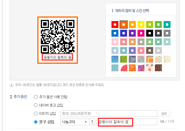 금동이의 칼퇴의 꿈으로 문구 삽입을 하였더니, QR코드 밑에 금동이의 칼퇴의 꿈이 뜬 것을 볼 수 있습니다. 테두리 컬러는 주황색으로 변경해 보았습니다.