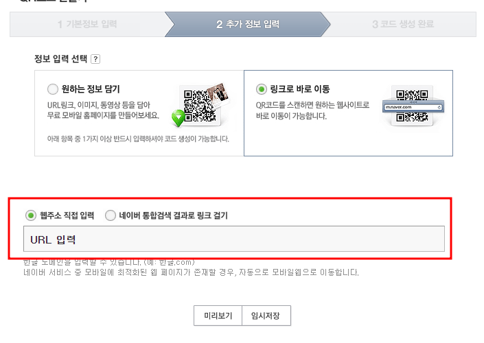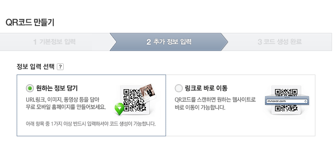 문구까지 넣어주었다면 다음 단계로 넘어가면 QR코드 추가 정보 입력이 나옵니다. 원하는 정보 담기 링크로 바로 이동 두 가지 종류가 있습니다. 먼저 원하는 정보 담기를 살펴보겠습니다.