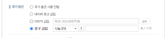추가 옵션을 사용하지 않아도 되고, 네이버 로고를 삽입해도 되거나, 이미지 삽입을 하셔도 됩니다. 저는 문구 삽입을 해 보겠습니다.
