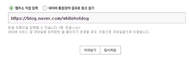 링크 바로 이동은 단순하게 웹주소 직접 입력, 네이버 통합검색 결과로 링크 걸기 2종류가 있는 것을 볼 수 있습니다. 저는 웹주소 직접 입력을 해 보겠습니다.