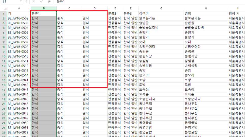 확인을 누르면 분류 2, 분류 3에 덮어씌워지기가 됩니다. 그래서 우리는 사전에 빈열을 추가 삽입해야 합니다.