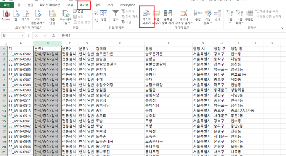 우리는 여기서 B 열을 구분 기호로 분리를 해 보겠습니다.