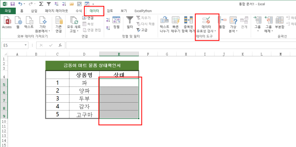 2. 금동이 마트 물품 상태 확인서에 상태 셀을 선택해 주고 데이터 유효성 검사를 해줍니다.