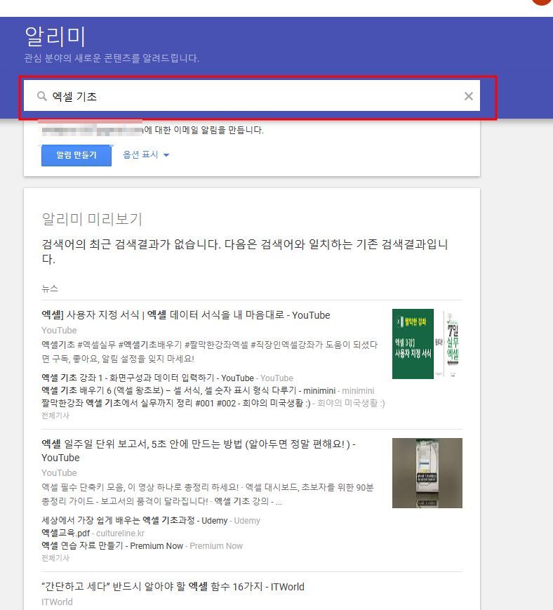 엑셀 기초를 검색해 줍니다. 그럼 알리미 미리 보기가 쭈르륵 나옵니다. 뉴스 또는 웹 부분이 검색이 될 겁니다.